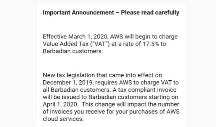 To ensure compliance, Amazon has urged Barbadian residents whose accounts are not listed in Barbados, to update their details by visiting the Billing Address and Contact Address page of the AWS Billing Console.