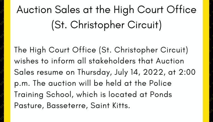 The High Court Office (St. Christopher Circuit) wishes to inform all stakeholders that Auction Sales resume on Thursday, July 14, 2022, at 2:00 p.m. The auction will be held at the Police Training School, which is located at Ponds Pasture, Basseterre, Saint Kitts.