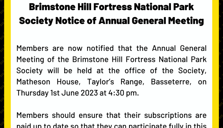 Members are now notified that the Annual General Meeting of the Brimstone Hill Fortress National Park Society will be held at the office of the Society, Matheson House, Taylor’s Range, Basseterre, on Thursday 1st June 2023 at 4:30 pm.