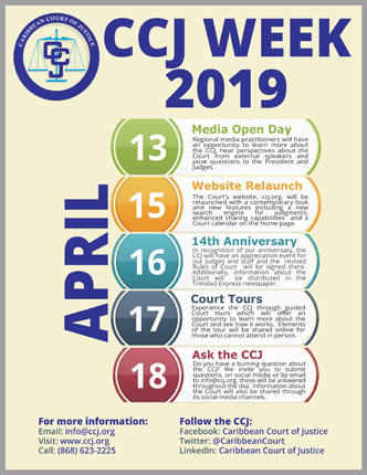 Throughout the week, the CCJ will share information about the Court on its social media platforms on Twitter, LinkedIn and Facebook. The celebratory activities will close on the 18th of April where the CCJ will answer questions from the public on various platforms. There will be a particular focus to sharing information on the CCJ’s social media platforms, on Thursday, the 18th of April, when the CCJ’s social media platform will provide answers to questions submitted on social media and through an email address, info@ccj.org. Members of the public are invited to pose questions directly to representatives from the CCJ.