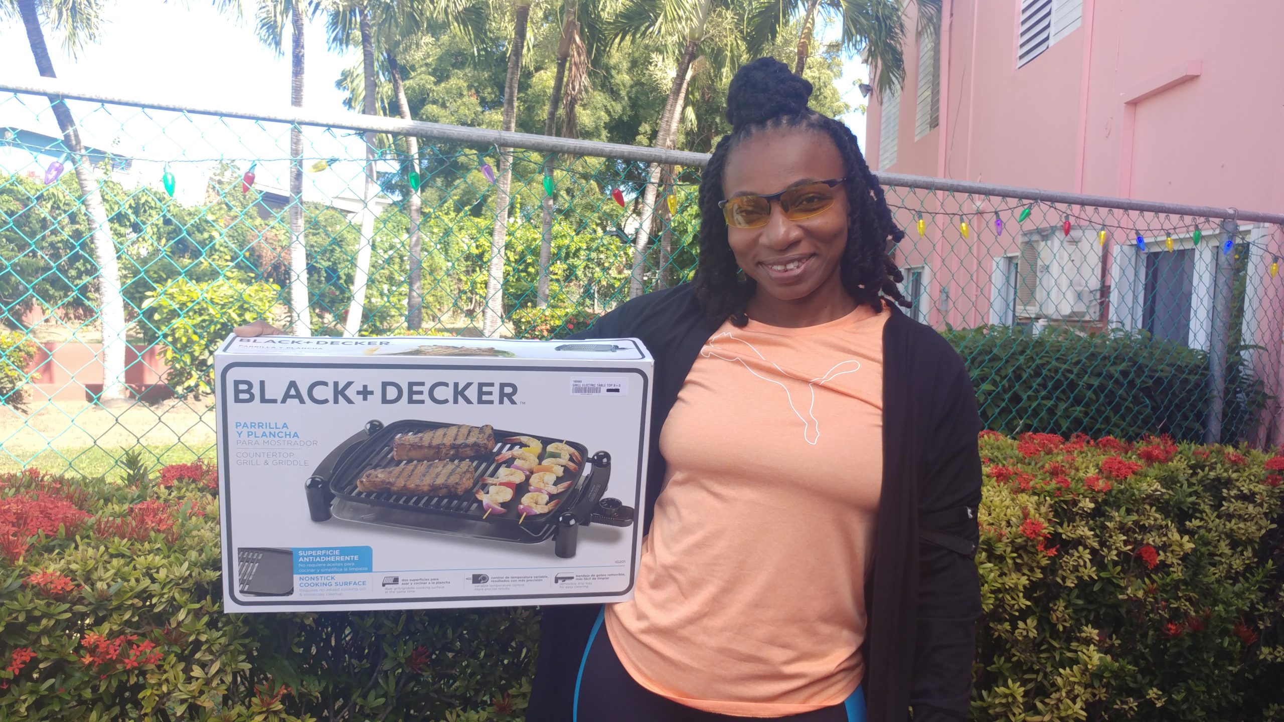 “Natasha, On behalf of Celebrate SKN, we want to congratulate you on winning the first ever Christmas decorating contest. You Christmas decorations were definitely off the charts and we just want to congratulate you and congratulate you with this trophy as our first place winner as well as a cash prize for your hard work.”