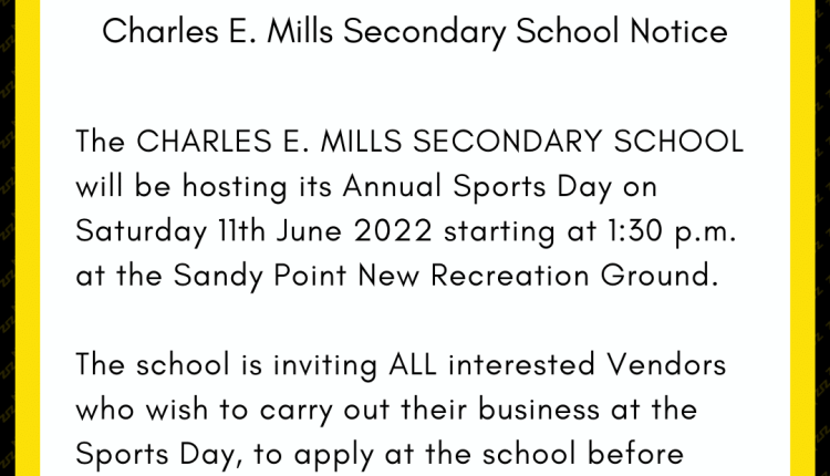 The CHARLES E. MILLS SECONDARY SCHOOL will be hosting its Annual Sports Day on Saturday 11th June 2022 starting at 1:30 p.m. at the Sandy Point New Recreation Ground.