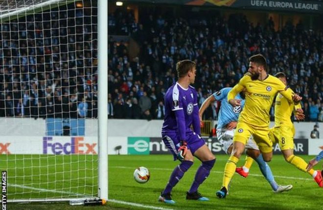 Chelsea claimed a narrow victory over Malmo in the Europa League after they were greeted with a rousing atmosphere in Sweden for the first leg of their last 32 tie.