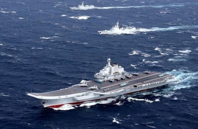 China’s only aircraft carrier has led several warships across the Taiwan Strait, Taiwan’s defence ministry said.