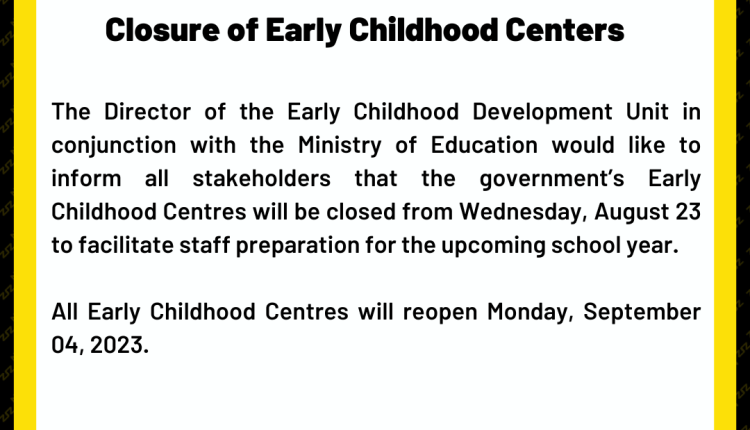 The Director of the Early Childhood Development Unit in conjunction with the Ministry of Education would like to inform all stakeholders that the government’s Early Childhood Centres will be closed from Wednesday, August 23 to facilitate staff preparation for the upcoming school year.