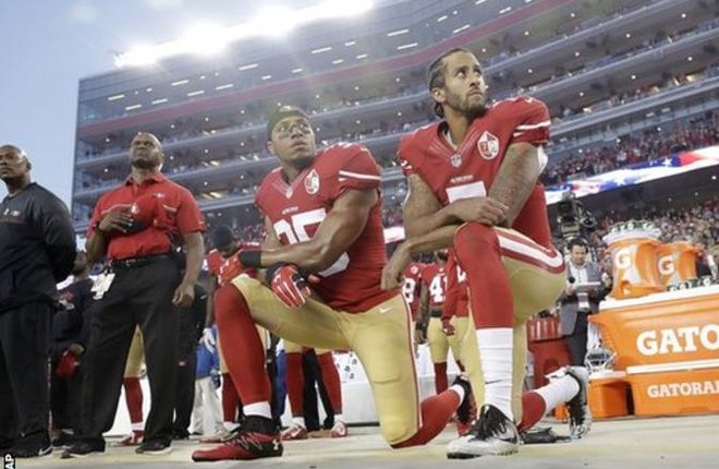 Team-mate Eric Reid knelt with Kaepernick, while two others – Antoine Bethea and Eli Harold – raised fists during the Star Spangled Banner.
