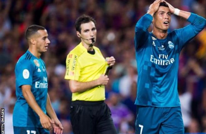 Cristiano Ronaldo has been suspended for five games after he was sent off in Real Madrid’s 3-1 win against Barcelona in the Spanish Super Cup first leg on Sunday.