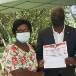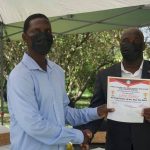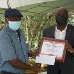Mr. Donald Daniel was awarded Farmer with the Most Throughput at the Marketing Division for 2020, receiving one acre of land preparation, seeds valued at $200, one bag of Urea, and two bags of NPK. Mrs. Avonelle Warner was awarded Farmer with the Most Throughput at the Abattoir for 2020. She received Medication and veterinary services valued at $200 from the Veterinary Division, $200 exemption from slaughtering fees, and four bags of general purpose feeds from the Supply Office.