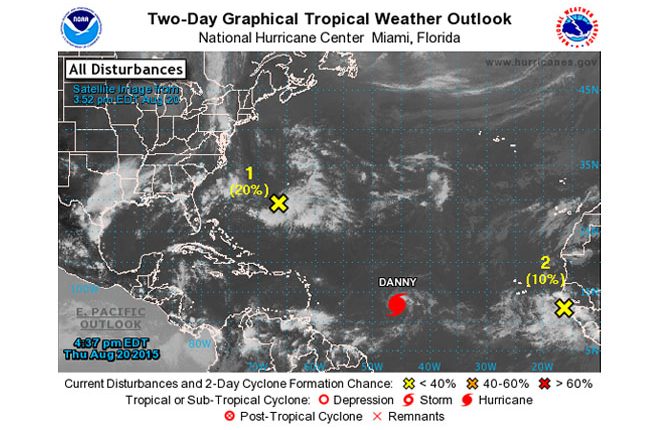 As of 5pm Thursday, the center of Hurricane Danny was located about 1,030 miles east of the Windward Islands, according to information from the National Hurricane Center.