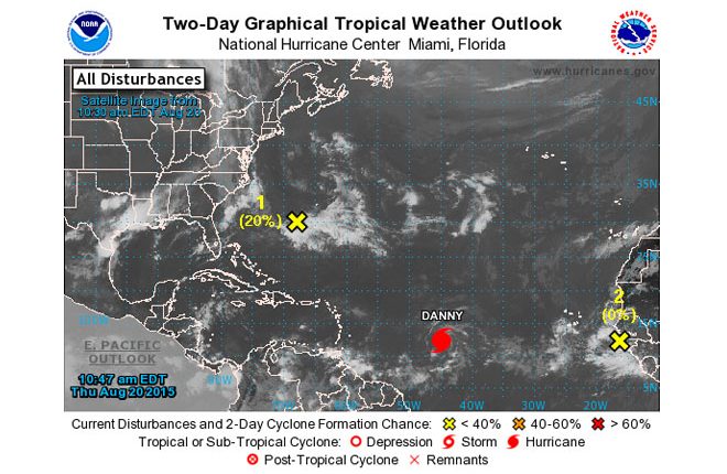 Maximum winds are at 75mph and Danny continues on a westward track at 10mph.