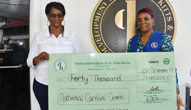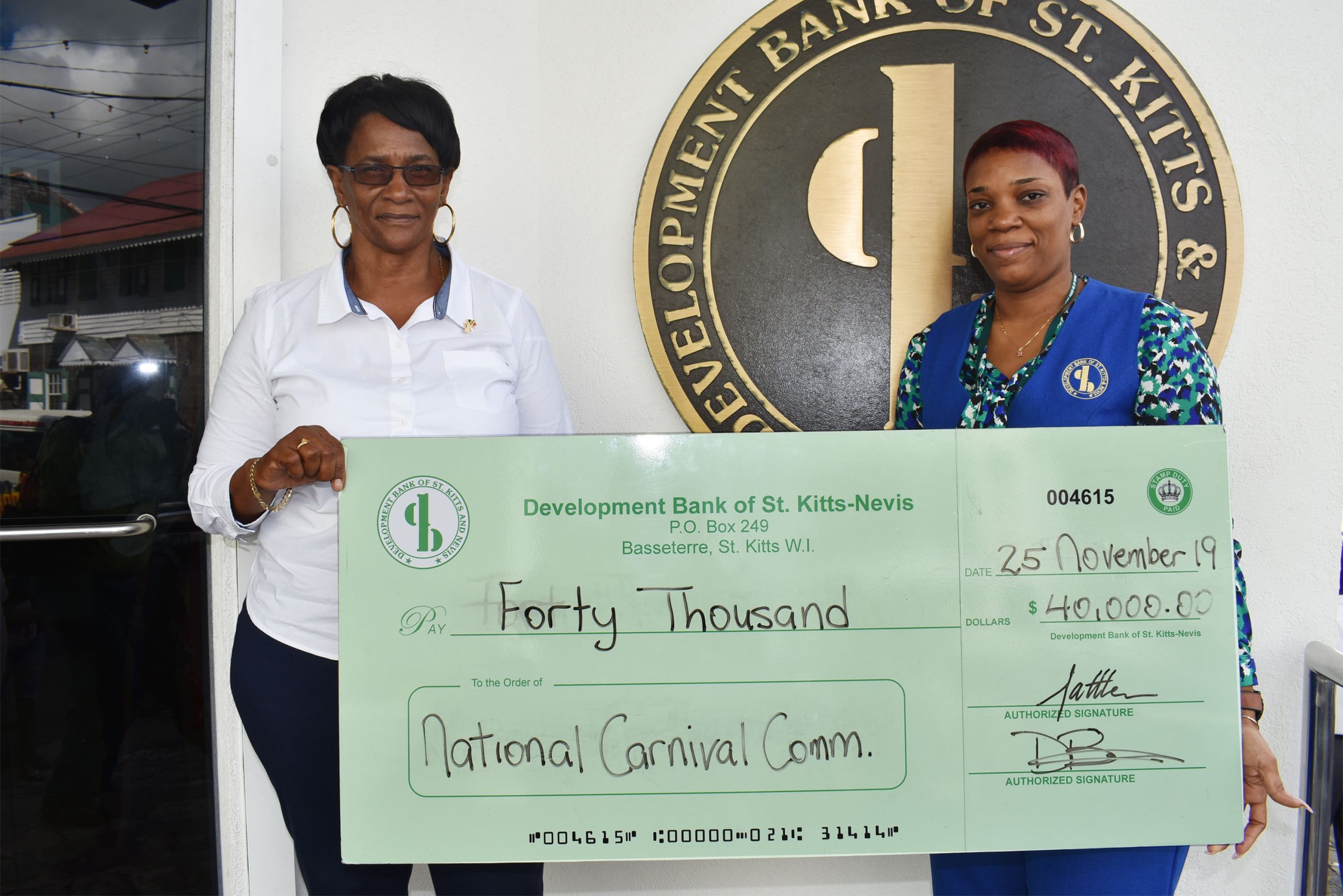 For its continued partnership with the St. Kitts-Nevis National Carnival, the Development Bank of St. Kitts and Nevis was late last month applauded by Ms Shirley Julius, Chairperson for Sponsorship at the St. Kitts-Nevis National Carnival when she received Development Bank’s sponsorship cheque from Ms Vernitha Evelyn-Maynard, bank’s Marketing Officer.
