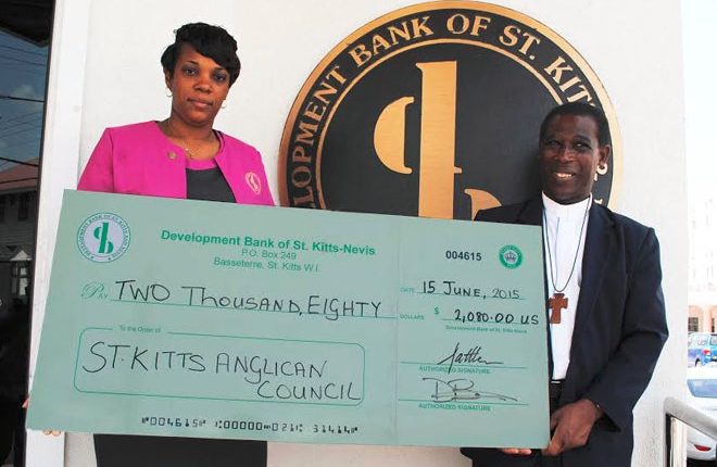 According to the bank’s Support Officer for Marketing Mrs Vernitha Maynard, who presented the bank’s sponsorship cheque of US$2,080 (EC$5,653) to Rev Canon Isaiah Phillip, management of the Development Bank of St. Kitts and Nevis is pleased to be associated with the hosting of this critical regional church meeting in the Federation.