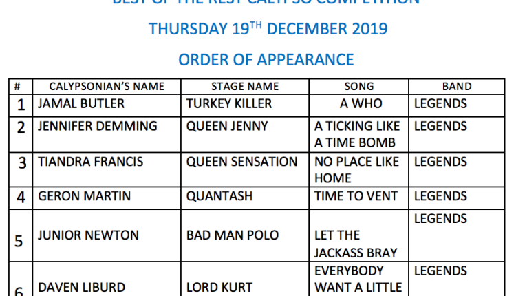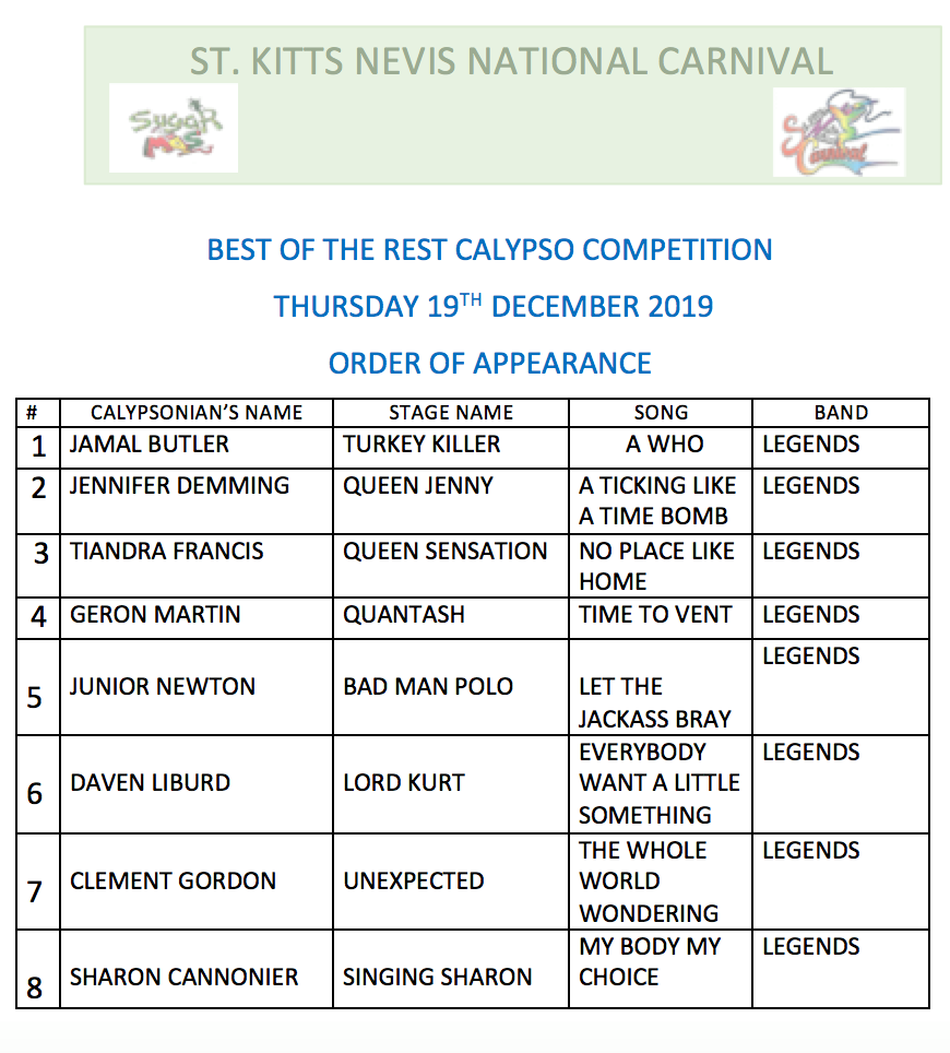 Basseterre, St. Kitts, December 18, 2019 (ZIZ News): 8 Calypsonians have been selected for this year’s Best Of The Rest Competition slated for tomorrow.