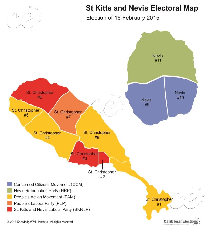 Saint Kitts and Nevis Labour Party 10,316 37.09 2 –1