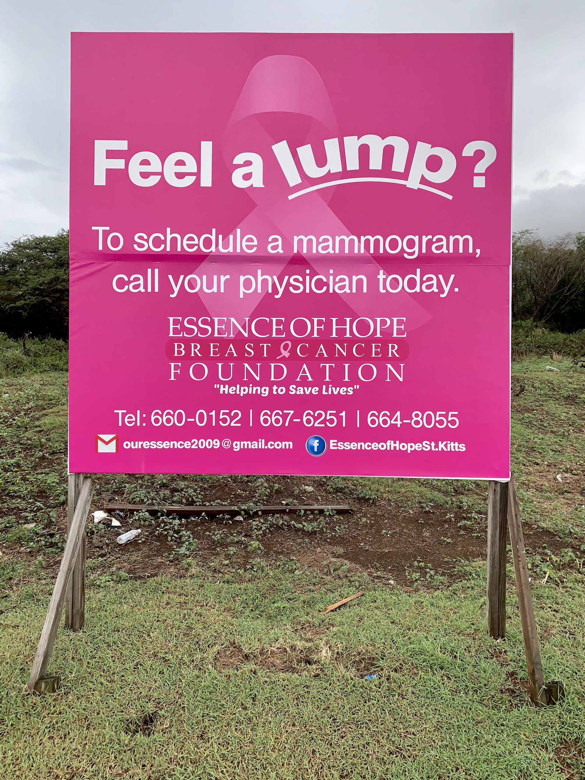 BASSETERRE, St. Kitts: On the eve of Breast Cancer Awareness Month, the Essence of Hope Breast Cancer Foundation has launched its mammogram campaign. As part of this campaign, a billboard has been erected at the roundabout leading to St. Peter’s. The billboard encourages women, that “Feel a lump”, to schedule a mammogram through their physician.
