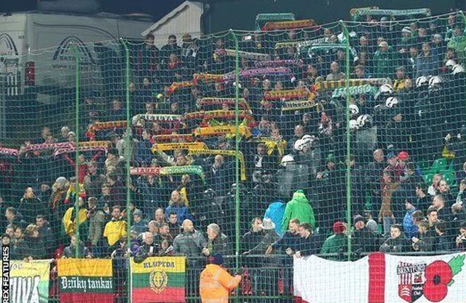 Riot police quelled skirmishes between rival fans behind one of the goals just before kick-off in Vilnius.
