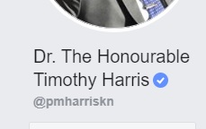 Facebook has verified Prime Minister Harris’ official page by placing a white check mark inside a blue circle next to the Prime Minister’s name, Dr. The Honourable Timothy Harris. This blue circle appears just above @pmharriskn.