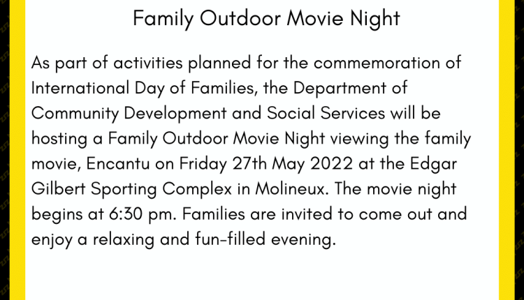 As part of activities planned for the commemoration of International Day of Families, the Department of Community Development and Social Services will be hosting a Family Outdoor Movie Night viewing the family movie, Encantu on Friday 27th May 2022 at the Edgar Gilbert Sporting Complex in Molineux. The movie night begins at 6:30 pm. Families are invited to come out and enjoy a relaxing and fun-filled evening.