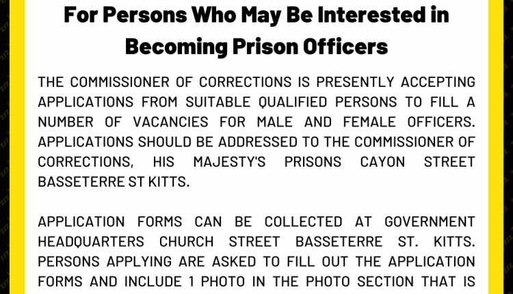 THE COMMISSIONER OF CORRECTIONS IS PRESENTLY ACCEPTING APPLICATIONS FROM SUITABLE QUALIFIED PERSONS TO FILL A NUMBER OF VACANCIES FOR MALE AND FEMALE OFFICERS. APPLICATIONS SHOULD BE ADDRESSED TO THE COMMISSIONER OF CORRECTIONS, HIS MAJESTY’S PRISONS CAYON STREET BASSETERRE ST KITTS.