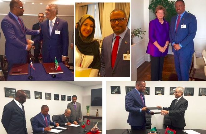 In his quest to improve relations with as many of the UN Member States as possible, the Minister was pleased to journey to the Mission of The Maldives where he formally executed instruments to establish diplomatic relations between St Kitts and Nevis and the Maldives. Our two countries share commonalities including being Small Island Developing States (SIDS). The Foreign Minister of the Maldives was pleased to commit to widening and deepening the relationship between both our countries.