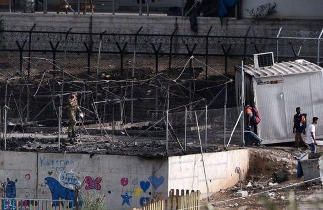 The Greek government is to send a ship to provide accommodation for more than 1,000 migrants after fire destroyed large areas of their camp on the island of Lesbos.