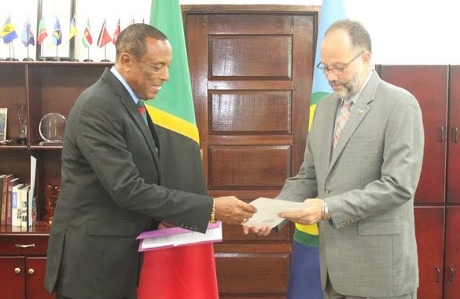 Basseterre, St. Kitts (SKNIS) — In a brief, yet very symbolical ceremony held at the Office of the Secretary General of CARICOM in Guyana on Tuesday 22nd September, St. Kitts and Nevis Ambassador to CARICOM, His Excellency (H.E.) Lionel Sydney Osborne presented his credentials to Ambassador Irwin La Rocque, signalling his official accreditation to the prestigious regional body.