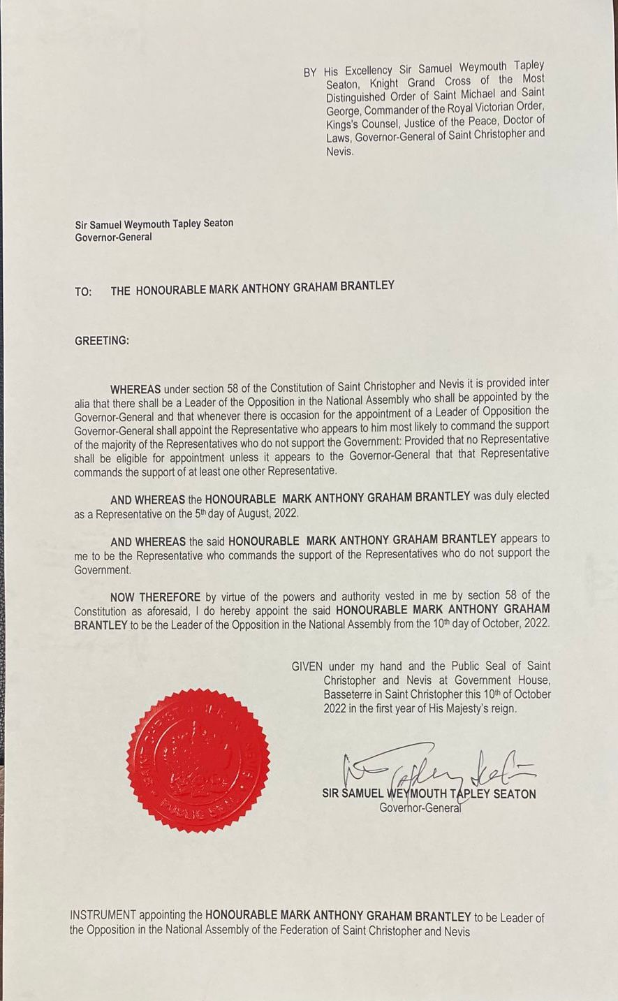 CHARLESTOWN NEVIS, October 19, 2022 (NIA) – Premier of Nevis, Hon. Mark Brantley, Leader of the Concerned Citizens Movement (CCM), has been appointed Leader of the Opposition in the National Assembly of St. Kitts and Nevis.