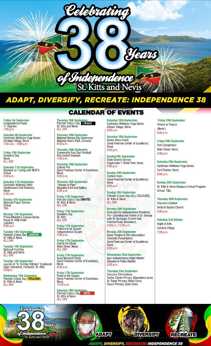 The official Calendar of Events for the 38th Anniversary of Independence of St. Kitts and Nevis can be accessed via St. Kitts and Nevis Information Service (SKNIS) website at sknis.kn, as well as the department’s Facebook page: St. Kitts and Nevis Information Service.