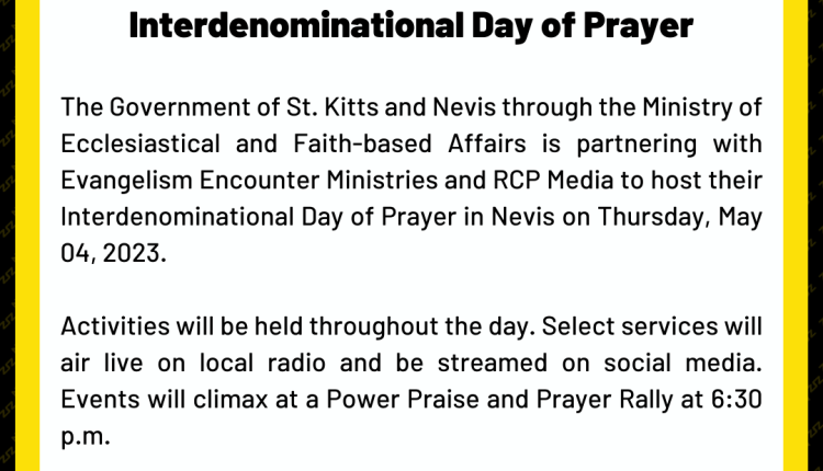 The Government of St. Kitts and Nevis through the Ministry of Ecclesiastical and Faith-based Affairs is partnering with Evangelism Encounter Ministries and RCP Media to host their Interdenominational Day of Prayer in Nevis on Thursday, May 04, 2023.