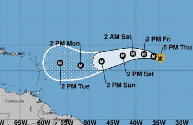 According to the National Hurricane Center (NHC) in Miami, at 5:00 pm EDT the centre of Hurricane Irma was located about 720 miles (1,160 km) west of the Cabo Verde Islands and about 1,780 miles (2,865 km) east of the Leeward Islands moving toward the west-northwest near 12 mph (19 km/h)