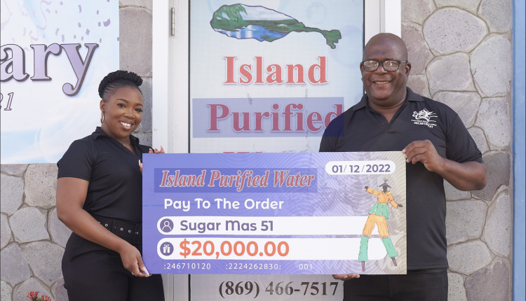 Basseterre, St. Kitts, December 2, 2022 (SKNNCC) — Island Purified has signed on as the official water provider for Sugar Mas 51. The handing-over ceremony took place on Thursday, December 1 at their Outlet in Basseterre. Manager, Murica Powell, represented Island Purified and handed over a cheque of EC$20,000 to Clement Ogarro, Public Relations Officer for the St Kitts Nevis National Carnival Committee (SKNNCC).