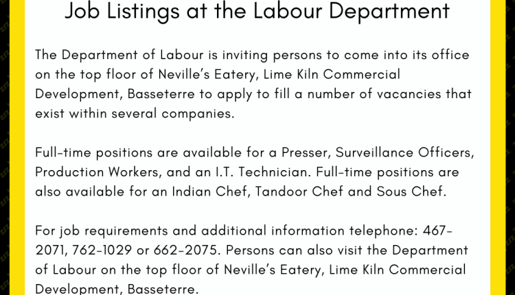 The Department of Labour is inviting persons to come into its office on the top floor of Neville’s Eatery, Lime Kiln Commercial Development, Basseterre to apply to fill a number of vacancies that exist within several companies.