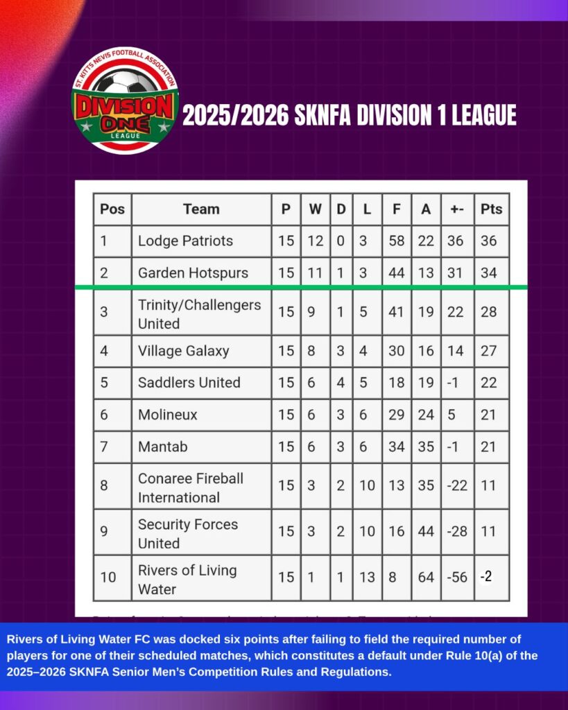 In the most dramatic finish of the week, T’Koi Huggins headed home a stoppage-time winner in the 90+2nd minute to give Skelec Garden Hotspurs a vital 1-0 victory over CIBC Village Galaxy at The Gardens in Basseterre. Both sides were goalless heading into injury time, but Huggins’ late header sent the home crowd into raptures and kept Hotspurs two points behind leaders Lodge Patriots. For Village Galaxy, the last-gasp defeat is a bitter blow — they remain fourth on 27 points but will need results to go their way if they are to secure a top-two finish.