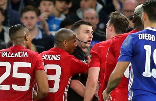 Referee Michael Oliver was surrounded by several United players after sending off midfielder Ander Herrera 10 minutes before half-time.