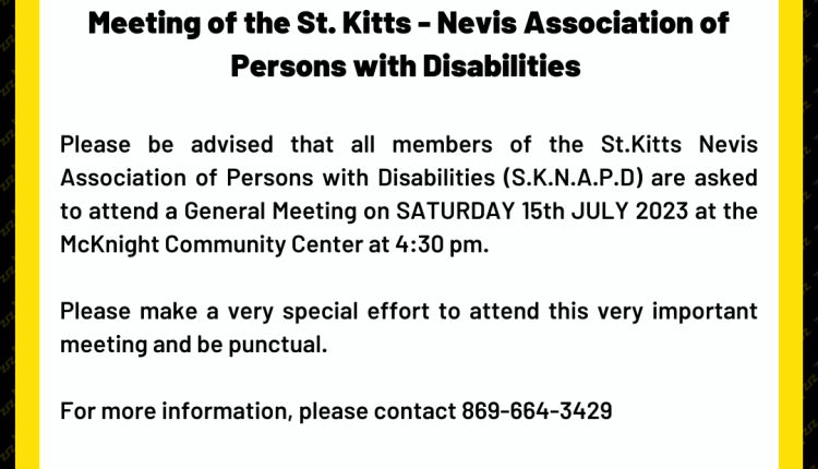 Please be advised that all members of the St.Kitts Nevis Association of Persons with Disabilities (S.K.N.A.P.D) are asked to attend a General Meeting on SATURDAY 15th JULY 2023 at the McKnight Community Center at 4:30 pm.