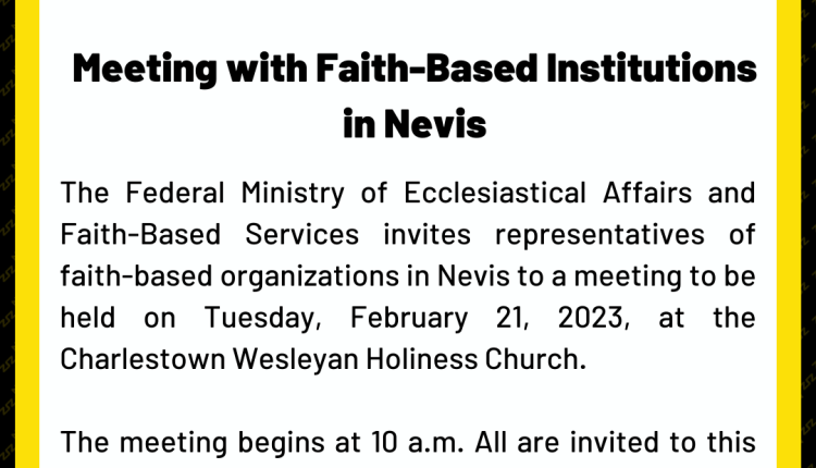 The Federal Ministry of Ecclesiastical Affairs and Faith-Based Services invites representatives of faith-based organizations in Nevis to a meeting to be held on Tuesday, February 21, 2023, at the Charlestown Wesleyan Holiness Church.