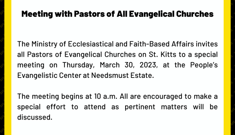 The Ministry of Ecclesiastical and Faith-Based Affairs invites all Pastors of Evangelical Churches on St. Kitts to a special meeting on Thursday, March 30, 2023, at the People’s Evangelistic Center at Needsmust Estate.