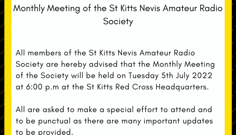 All members of the St Kitts Nevis Amateur Radio Society are hereby advised that the Monthly Meeting of the Society will be held on Tuesday 5th July 2022 at 6:00 p.m at the St Kitts Red Cross Headquarters.