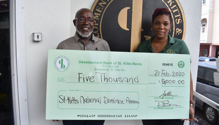 “Sponsorship by the Development Bank is the title sponsorship – now the tournament will be called the Development Bank National Domino Tournament,” explained interim Chairman Mr Romeo Parris when he received sponsorship cheque from Ms Vernitha Evelyn, Development Bank of St. Kitts and Nevis’ Marketing Officer on Friday February 21.