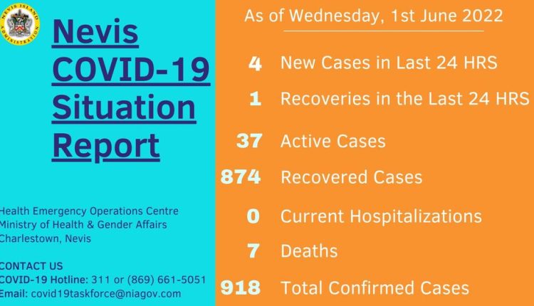 According to the Nevis COVID-19 Dashboard for Wednesday, June 01, 2022, four new cases had been reported in the past 24 hours and one recovered case. As of that date, there were 37 active COVID-19 cases on Nevis.