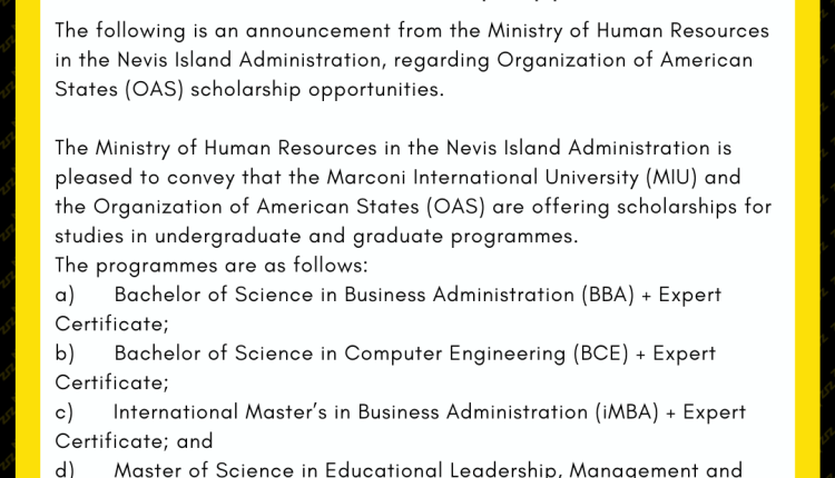 The Ministry of Human Resources in the Nevis Island Administration is pleased to convey that the Marconi International University (MIU) and the Organization of American States (OAS) are offering scholarships for studies in undergraduate and graduate programmes.