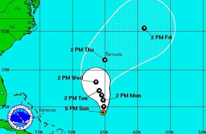 Tropical Storm was slowly strengthening on Sunday and is forecast to regain hurricane force by Monday afternoon as it begins a slow northward movement towards Bermuda after meandering for several days in the open Atlantic.