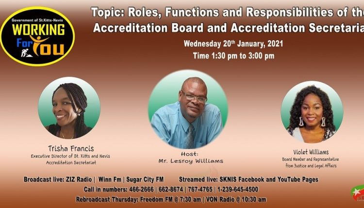 Basseterre, St. Kitts, January 19, 2021 (SKNIS): Officials from St. Kitts and Nevis Accreditation Secretariat will be featured on the popular government radio and television programme “Working for You” on Wednesday, January 20, 2021.