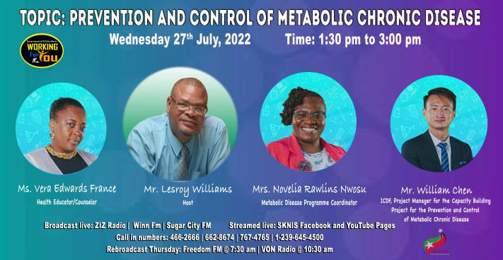 Basseterre, St. Kitts, July 25, 2022 (SKNIS): The Prevention and Control of Metabolic Chronic Disease will be discussed and spearheaded by officials from the Health Promotion Unit within the Ministry of Health on the popular government radio and television programme “Working for You” on Wednesday, July 27, 2022.