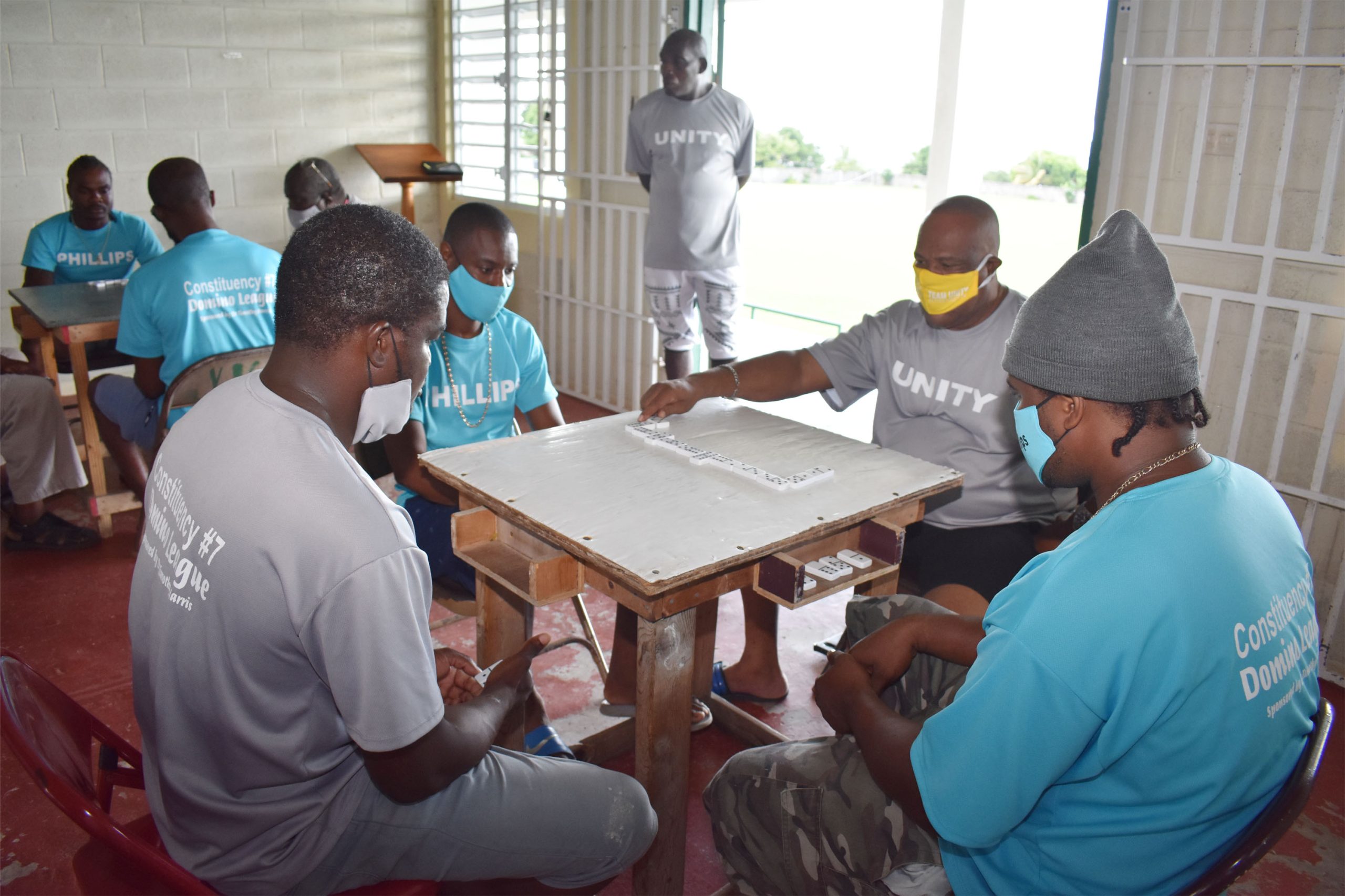 Simeon ‘Cuban’ Liburd of Unity Domino Club, closely watched by Captain Desmond ‘Fergie’ Rawlins (standing), in action when they beat Phillips Domino Club.