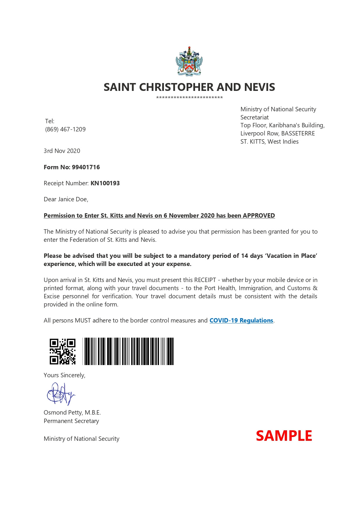 All incoming passengers to St. Kitts & Nevis are required to complete the Travel Authorization Form, which can be found at www.knatravelform.kn, prior to their arrival. International travelers must have their negative PCR-test and booked accommodation to complete the Travel Authorization Form required for entry. Once the form is completed and submitted, with a valid email address, it will be reviewed, and the visitor will receive an approval letter to enter the Federation (letter as pictured below).