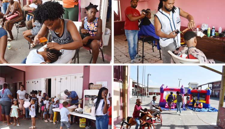 A team of nine hair-braiders and three barbers worked tirelessly, all making sure that the girls looked nice and fancy with their hair styles to school while the boys had nice haircuts to get themselves ready for school as well. And while waiting for their turn at either the hair-braider’s or the barber’s, the children were kept busy by bouncing castles, and for the first time a masquerades group, the St. Kitts Masquerades Ambassadors out of West Basseterre, entertained both the young and the old.