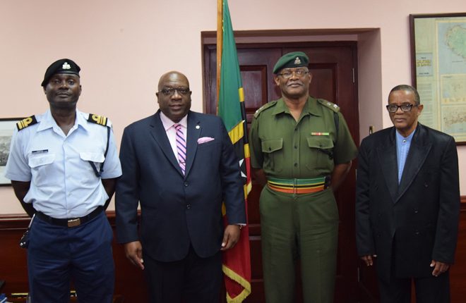 Shortly before addressing the nation and the press corps yesterday afternoon, Prime Minister Harris met in his office to take a photo with the Permanent Secretary in the Ministry of National Security, Mr. Osmond Petty; Lieutenant Colonel Commander Patrick Wallace, and Major Anthony Comrie. The Prime Minister of St. Kitts and Nevis thanked Commander Wallace and Major Comrie for their service and congratulated both men on their impending retirement and promotion, respectively, while wishing them well.