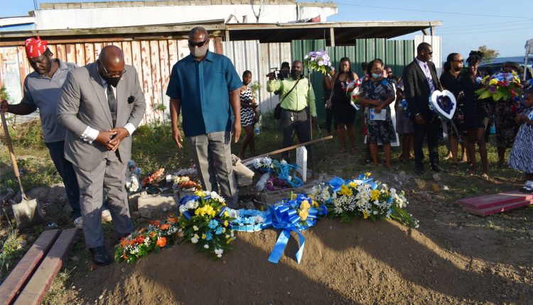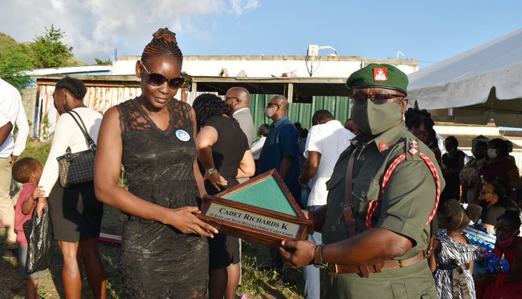 Prime Minister Harris, who stood with other mourners under a tent all that time, placed a wreath on the grave after the first wreaths would have been placed by Ms Denise Richard, mother of the deceased. She had earlier received a plaque bearing her son’s name from Captain Keithly Phillip, Officer Commanding Cadet Corps.