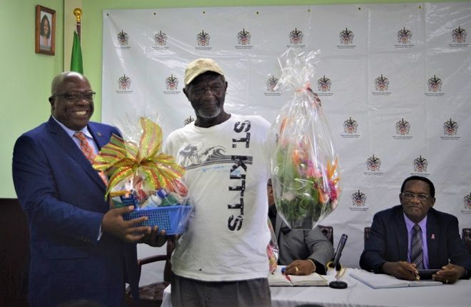 Ms. Pemberton of Central Basseterre, accepted her bouquet arrangement and gift basket and expressed thanks to the Prime Minister.